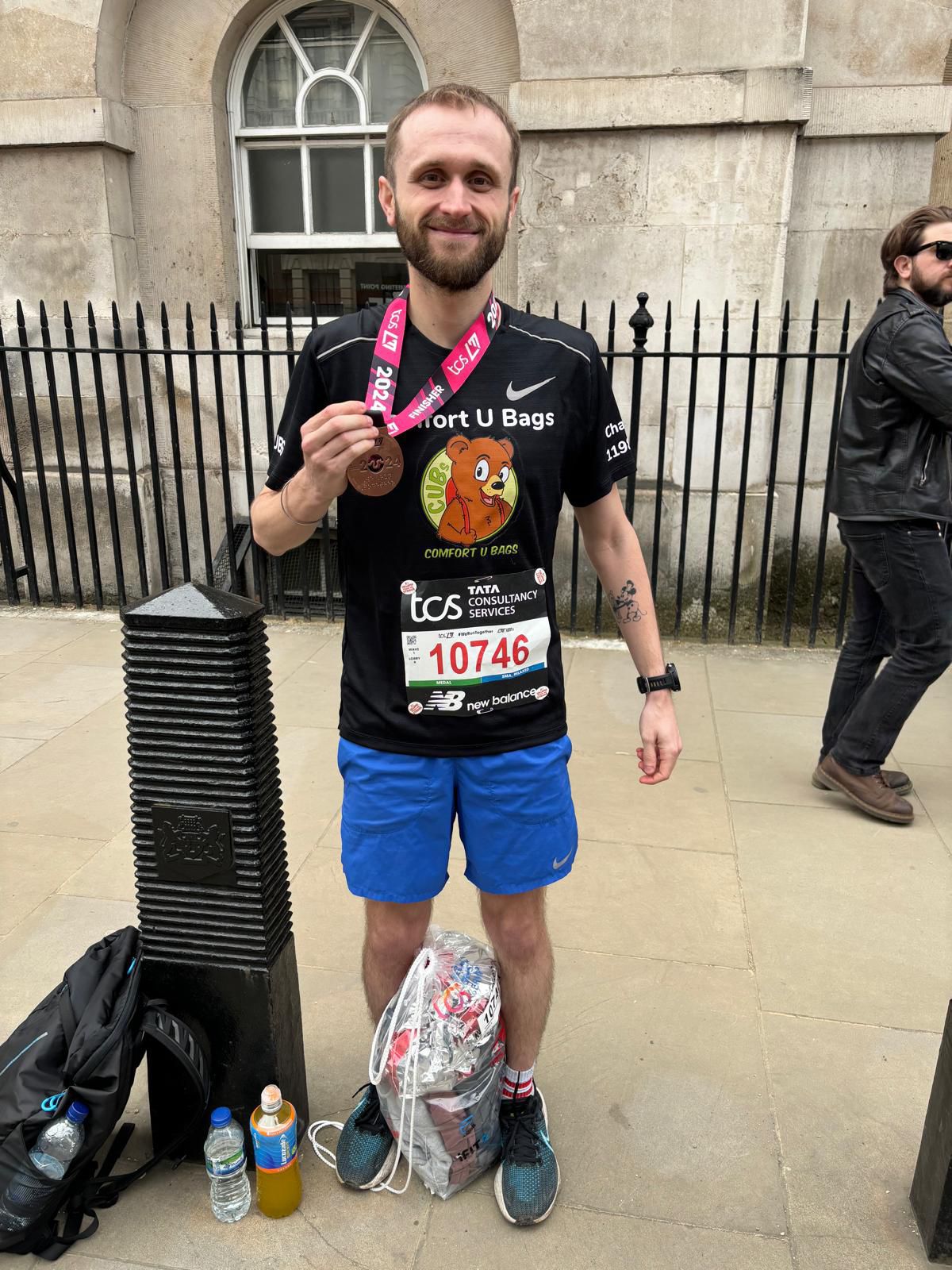 When our Colleague, Tom, decided to embark on the London Marathon in 2024, he was in no doubt that Comfort U Bags was deserving of his fundraising efforts! He set-up a PayPal Giving Fund, we ensured he had the right gear to promote us on the day and away he went! Incredibly, Tom completed the marathon in 3hours and 47 minutes raising a whopping £683 for CUBs. We’re blown away by the support everyone showed to Tom and to CUBs. Tom was so chuffed as you can see in these brilliant photos capturing the day.